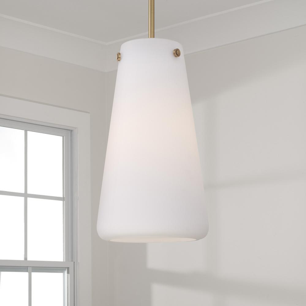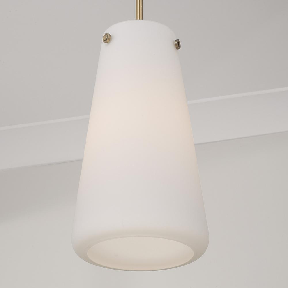 1-Light Pendant in Aged Brass with Tapered Soft White Glass