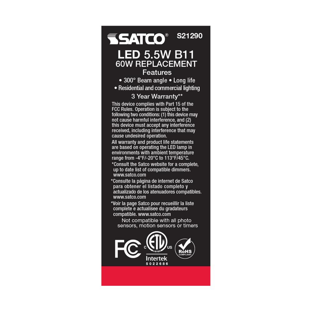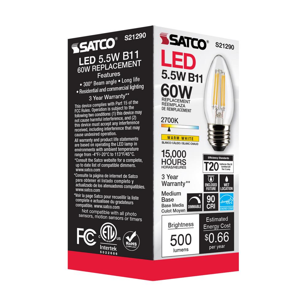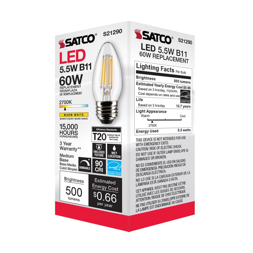 Satco's S21290 5.5-watt LED lamp is traditional, yet contemporary with its vintage style and energy saving LED technology. Elegantly illuminate any room in the house with this dimmable, clear bulb. Sophisticated and modern, this lamp delivers 15,000 ho