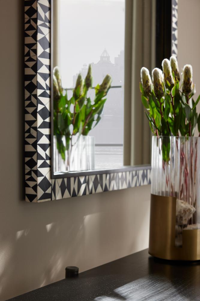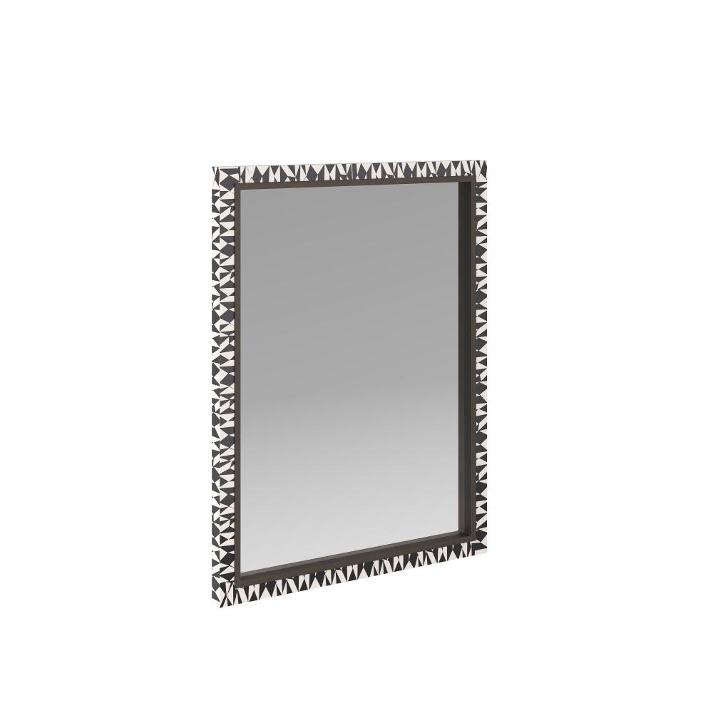 A delicate mosaic of black and white resin adorns a rectangular frame, surrounding an inset frame of bronzed iron. Designed to be reminiscent of a tribal pattern, its textural surface adds a handcrafted edge. Designed to be hung either horizontally or vertically, it is stabilized with a security cleat. Finish will vary.
