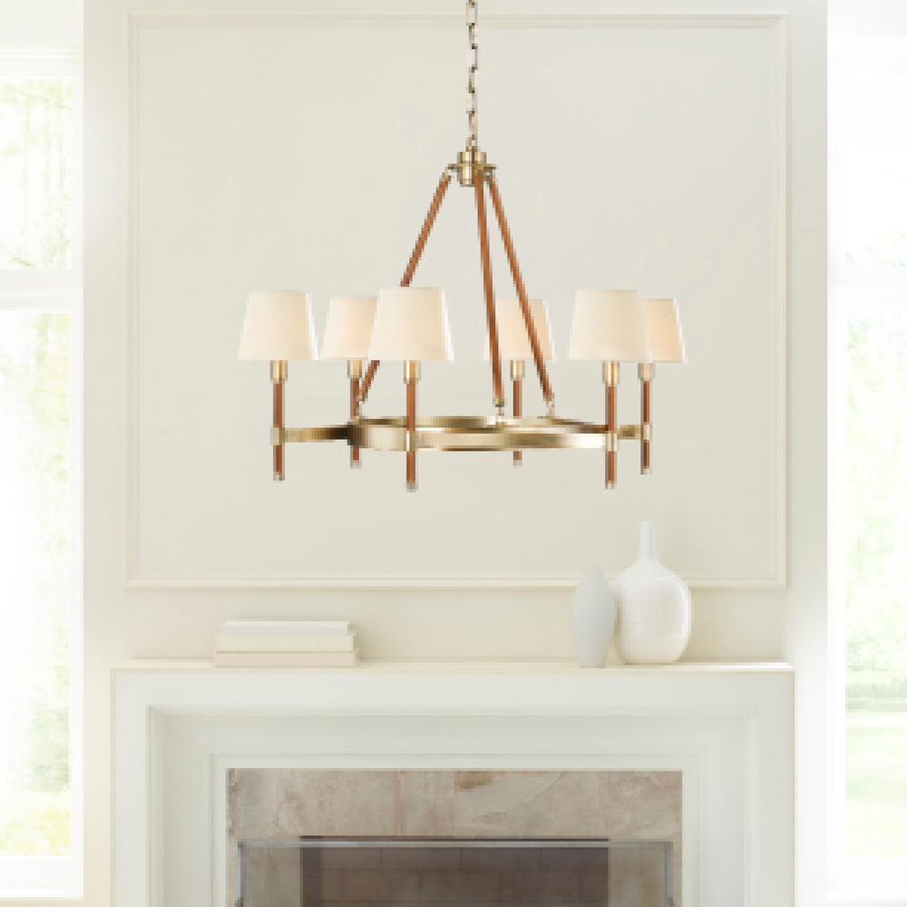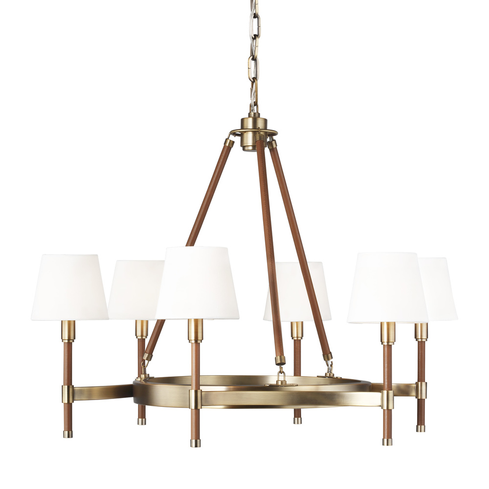 The Katie six light single tier chandelier in time worn brass features leather straps suspended from the chain to round out the design of this timeless series.