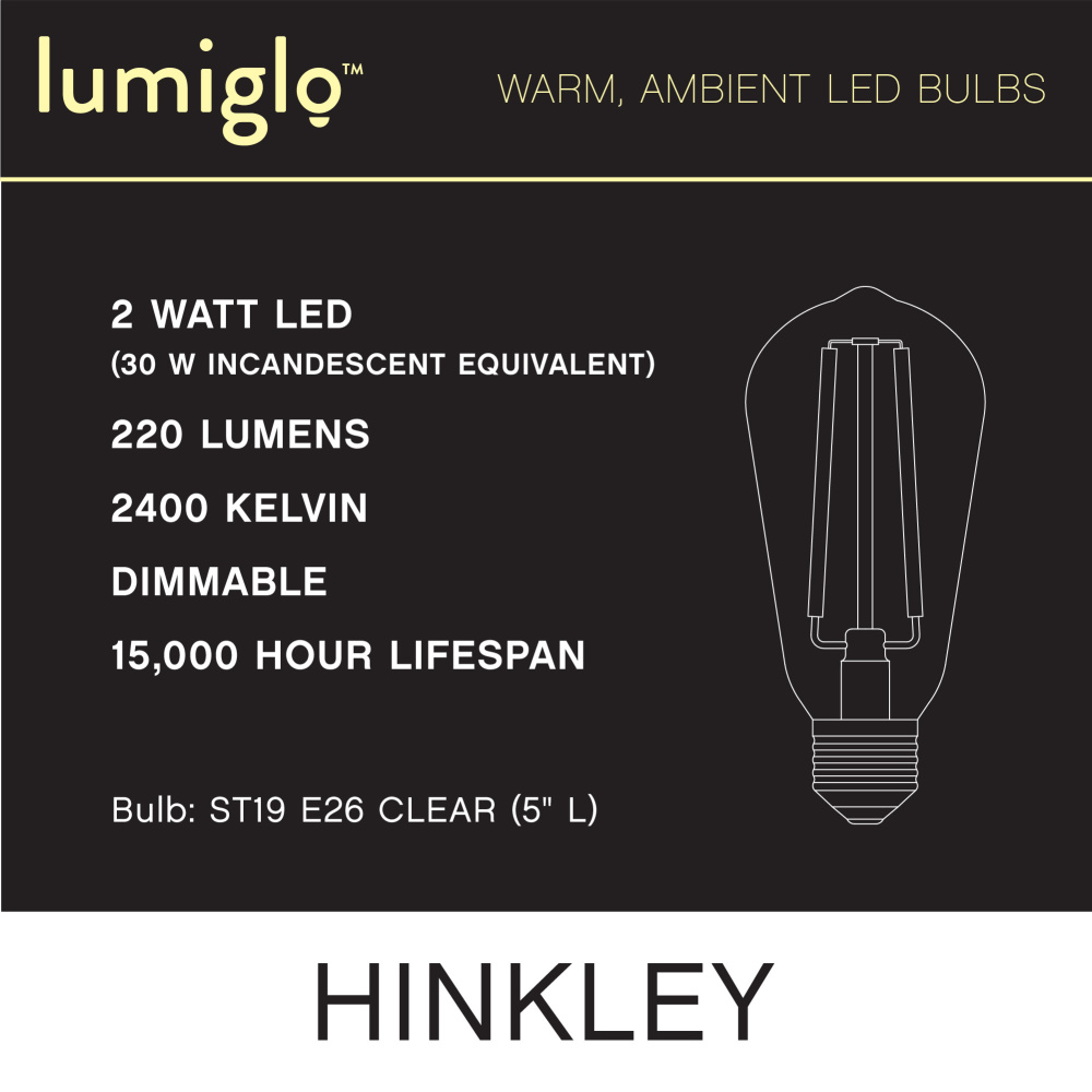 To create superior, softer light that sets the scene in any indoor or outdoor setting, Hinkley’s Lumiglo™ LED bulbs feature unique filament technology designed to cast a warm ambient glow. Dimmable functionality provides full control over brightness, allowing you to craft an atmosphere that perfectly accentuates your space.