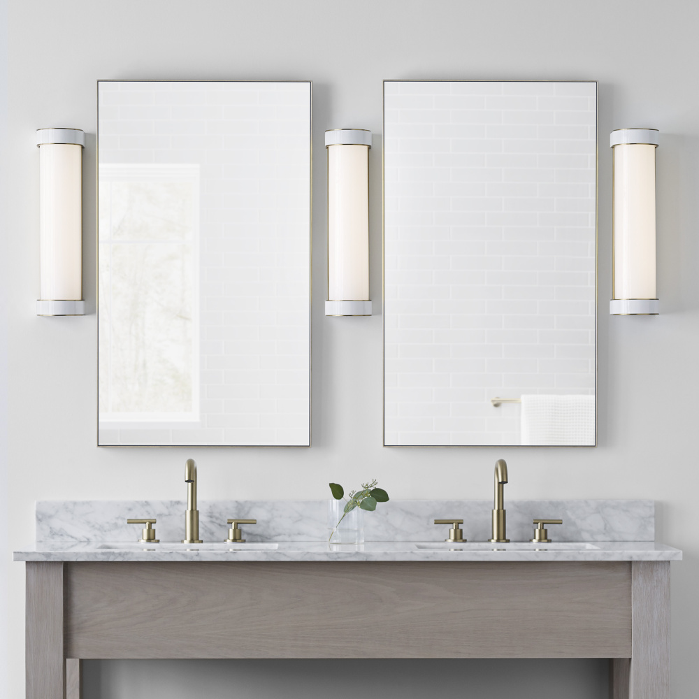 The Monroe vanity is inspired by graphic enameled metal jewelry and decorative accessories from kate spade with a nod to late 50s atomic era colorful designs. Monroe exhibits clean lighting profiles and dressed them up with painted sections and metal accents. Available in a Burnished Brass and Polished Nickel finish.