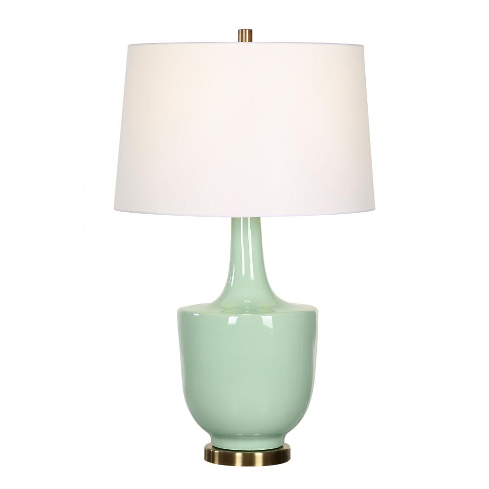 The Kyla Table Lamp Showcases Modern Elegance With Its Sleek Mint Green Ceramic Base Complemented By Antique Brass Plated Details. The Tapered Round Hardback Shade Is Covered In A Crisp White Linen Fabric.