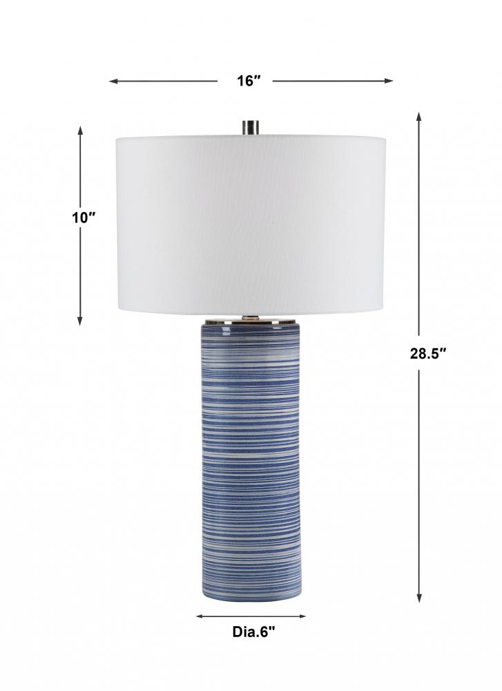 Showcasing Trendy White and Indigo Hues, This Ceramic Table Lamp Has A Striped Glaze with Polished Nickel Accents. The Round Hardback Drum Shade is A White Linen Fabric.