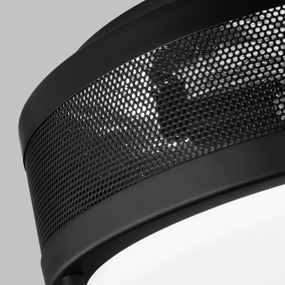 The Vander three light flush mount fixture in Midnight Black Vander is a loft-style flush mount featuring a perforated metal exterior banded an opal etched diffuser. Use it in a mudroom or laundry room for unfettered, functional light.