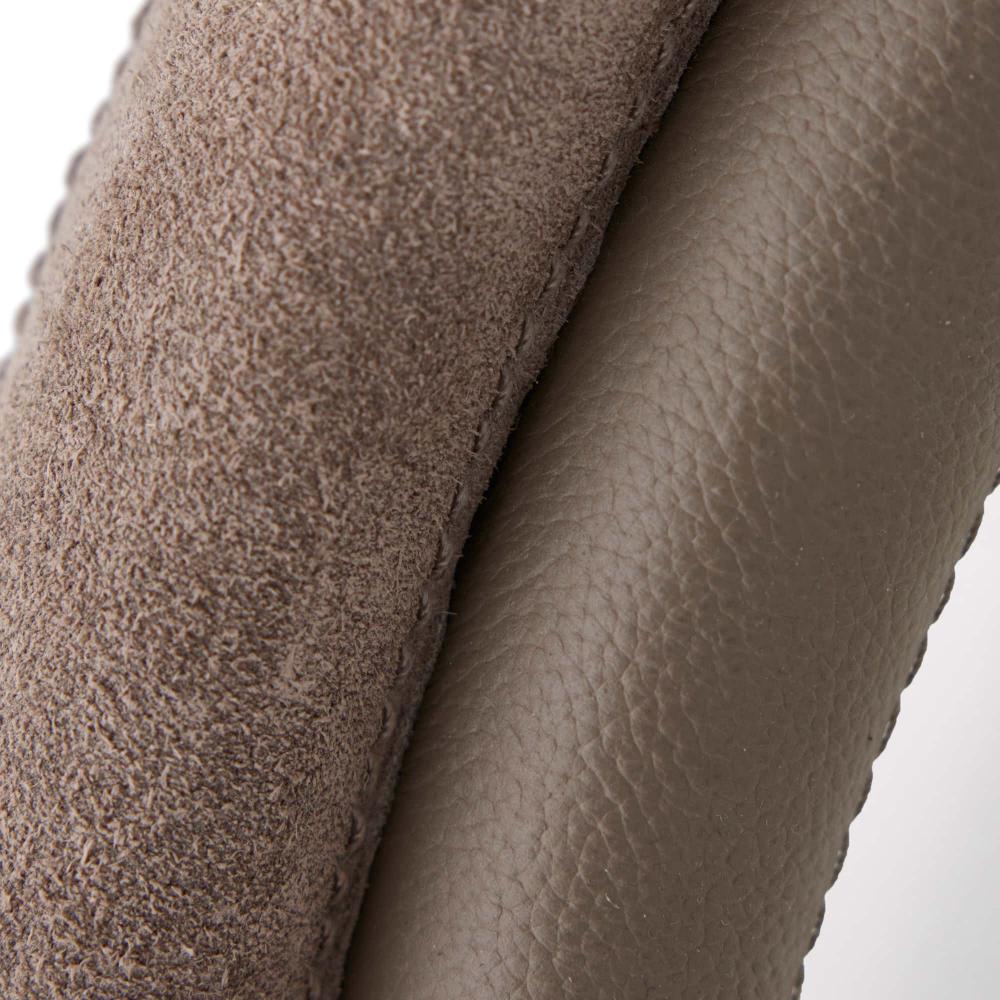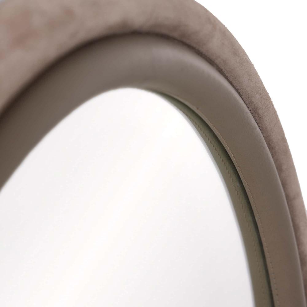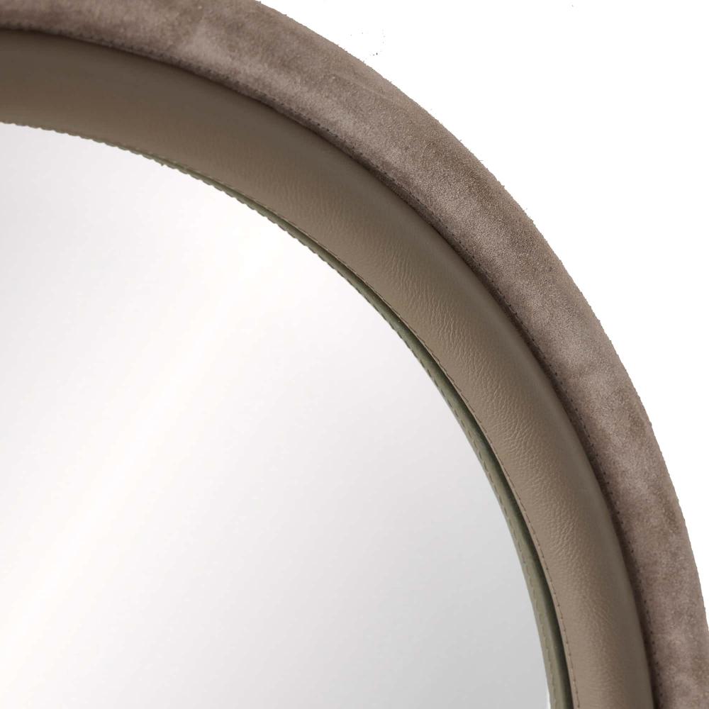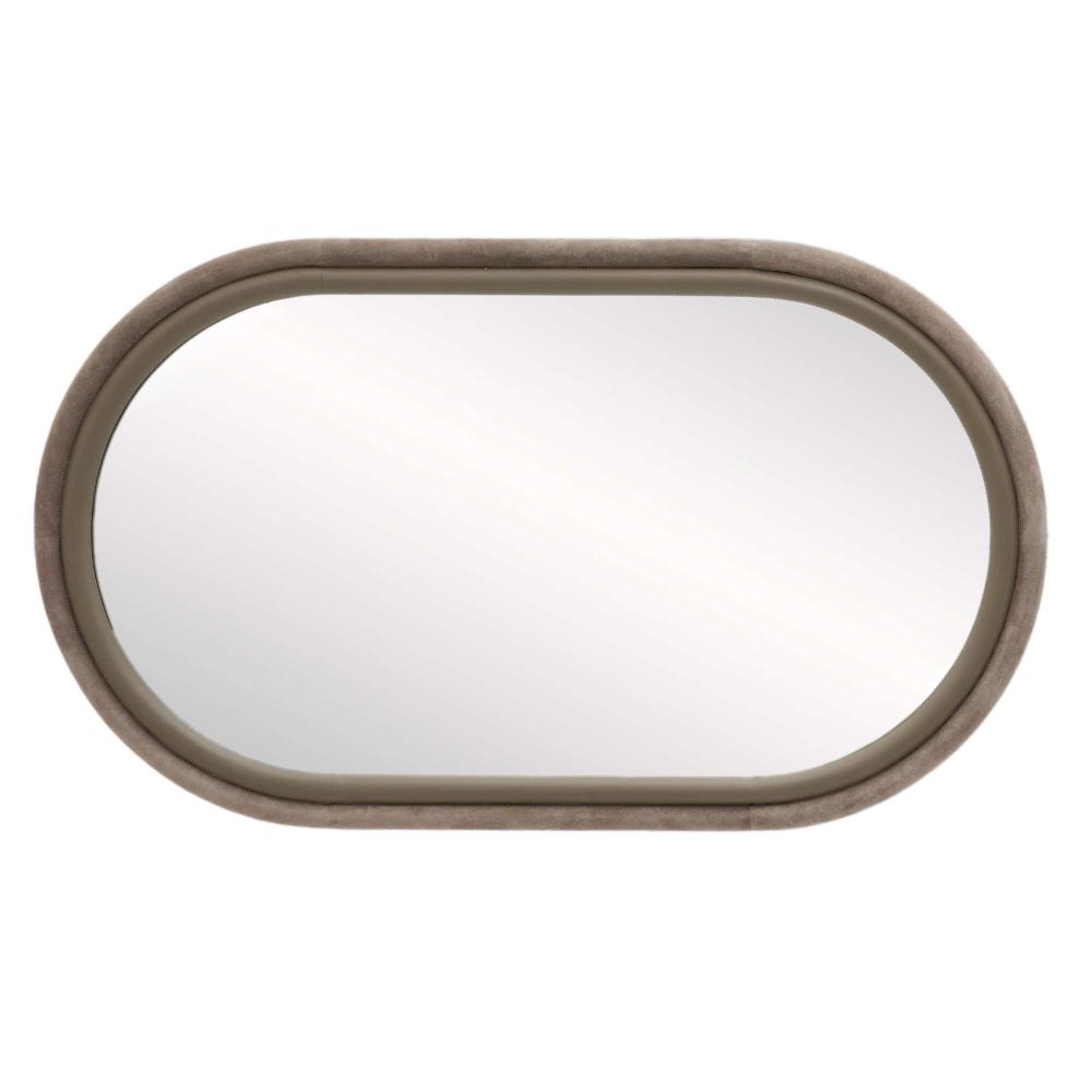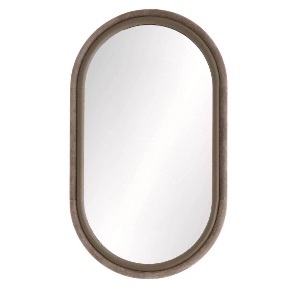 THE HANDSOME WEATHERS WALL MIRROR IS A FINE EXAMPLE OF TONAL SOPHISTICATION. THE ULTRA-VERSATILE, MIXED-MEDIA ACCENT IS CREATED IN DOVE GRAY LEATHER AND COORDINATING DOVE GRAY SUEDE, WHICH FORM A RACETRACK DESIGN AROUND THE CAPSULE-SHAPED MIRROR. THE MIRROR IS FITTED WITH A SECURITY CLEAT FOR HANGING. CAN HANG VERTICALLY OR HORIZONTALLY. FINISHES WILL VARY.